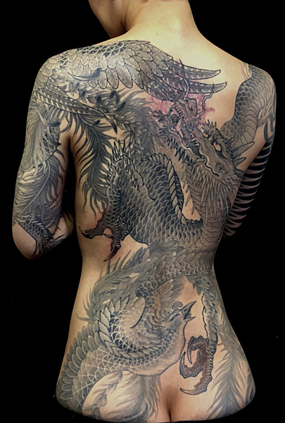 日本伝統刺青のなかでも絶大な人気を誇る「龍」は古代中国を起源とする想像上の霊獣である。