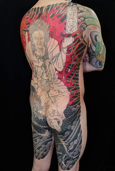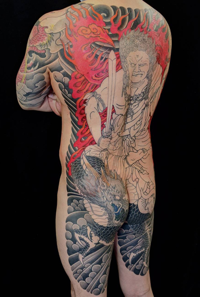 密教における大日如来の化身であり、如来の教えに背く者たちをその恐ろしい忿怒の形相で調伏し、 同時に背後に燃えさかる大火焔でその煩悩を焼きつくすといわれ、通常右手に剣、左手に羂索といわれるものを携えている。 日本伝統刺青においては単独か、その両脇に矜羯羅・制多迦の二童子を配したものや、この刺青画像のように龍にまたがったもの、 または不動明王が龍に変化し、剣にからみついた「具利迦羅龍」というのもよく彫られている。comment:額彫りが終了し、いよいよ不動明王本体の色付けです。